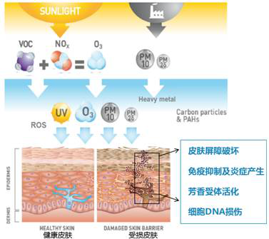 污染物PM2.5颗粒本身接触皮肤,引起表层皮脂氧化,造成第一层伤害;其次,污染物PM2.5颗粒、有机挥发物以及紫外线的协同作用之下,导致肌肤屏障受到损伤,造成第二层伤害;透过毛孔和受损的角质层屏障渗透到皮肤深层的PM2.5颗粒最终导致深层细胞发炎,即第三层伤害;更深层渗透后会导致基底细胞的细胞及DNA损伤,引起皮肤老化等深层伤害。