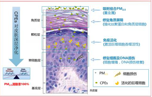 针对污染物PM2.5颗粒本身对皮肤的四层伤害,小球藻深层净化因子(CPEs)能够在皮肤表面吸附络合PM2.5,阻止表层皮脂氧化,弱化第一层伤害;其次,小球藻深层净化因子(CPEs)能够使角质层丝聚蛋白表达增加,活化角质细胞阻止污染物PM2.5颗粒、对肌肤屏障的损伤,对抗第二层伤害;小球藻深层净化因子(CPEs)能够激活巨噬细胞的吞噬能力,能够大量吞噬透过角质层屏障的PM2.5避免皮肤炎症产生,即阻止第三层伤害;第四层是小球藻深层净化因子(CPEs)修复受损的细胞及细胞DNA,阻止皮肤老化及深层伤害。